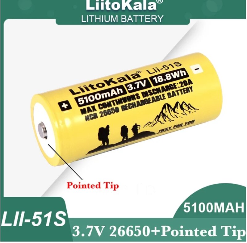 Batteria ricaricabile Liitokala 26650 agli ioni di Litio - Li.ion 3.7V 5100mAh peso 95 grammi, diametro 26 mm lunghezza 65 mm